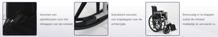 Comfort beensteun links/rechts, universele rolstoeltas, zitkussen en zitfixatiegordel.